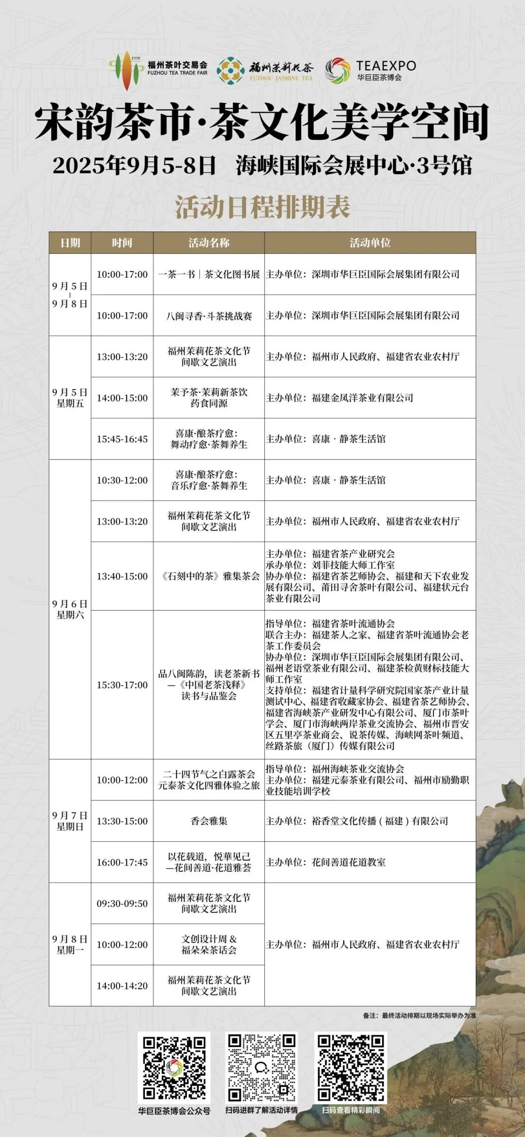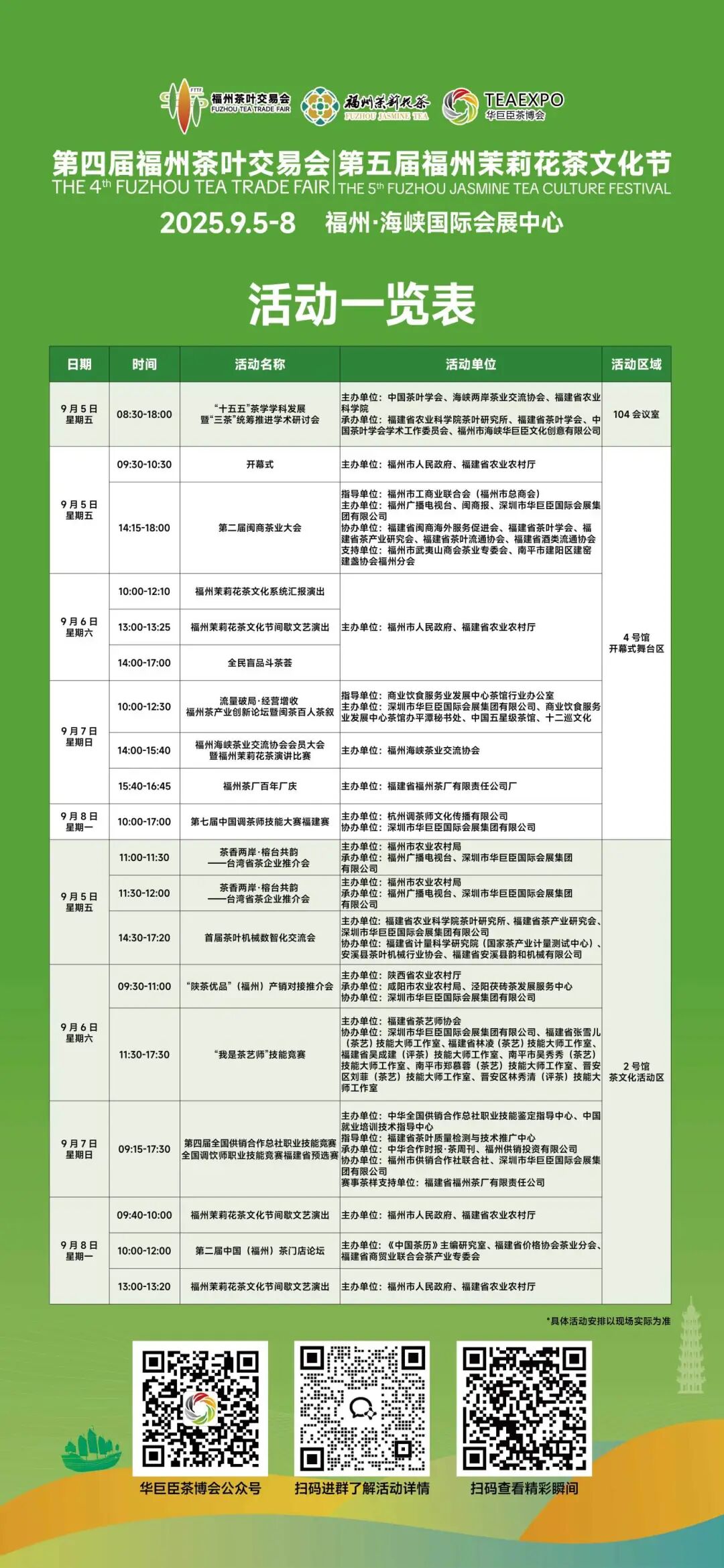 本屆展會由福州市人民政府、福建省農(nóng)業(yè)農(nóng)村廳作為支持單位,深圳市華巨臣國際會展集團有限公司主辦、福州海峽華巨臣文化創(chuàng)意有限公司承辦,將持續(xù)到9月8日,歡迎大家蒞臨現(xiàn)場,體驗茶香韻趣,共享合作商機!