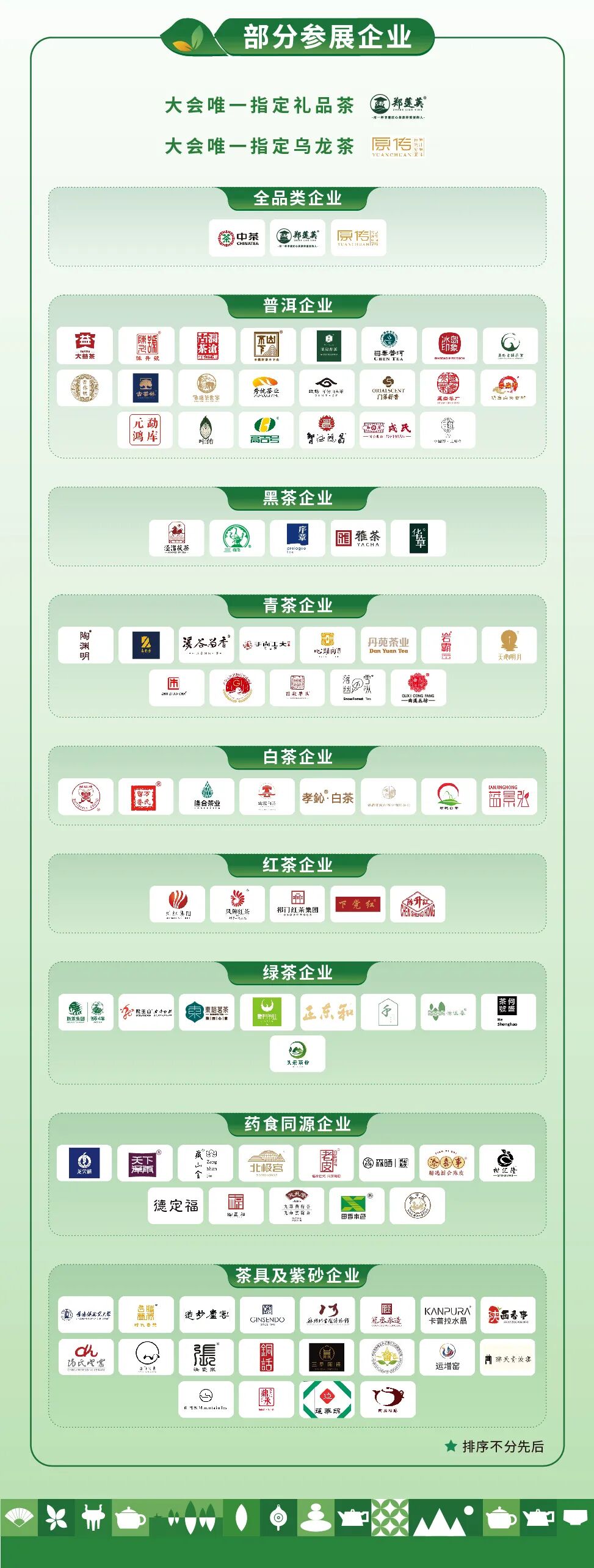 ?普洱茶:大益、瀾滄古茶、福今、陳升號、勐庫戎氏、不下山、鳳牌普洱、冰島印象、書劍、寶和祥、春茗古茶林、滇南古韻、普作號、昌泰普洱、智德鴻昌、鹿巖號、云南翟氏、象塘茶世家、紋物茶業(yè)、元鴻、葉佑、隆品、興飲祥、凝聚力、醉茗軒、勐景瑞、云鑫源、鹿巖普洱、璧魁普洱、臻德號、榮浩、凝聚力、宋聘祥、鴻業(yè)普洱、高吉號、順滿號、勐俊源,依雅軒、老曼峨古茶山。